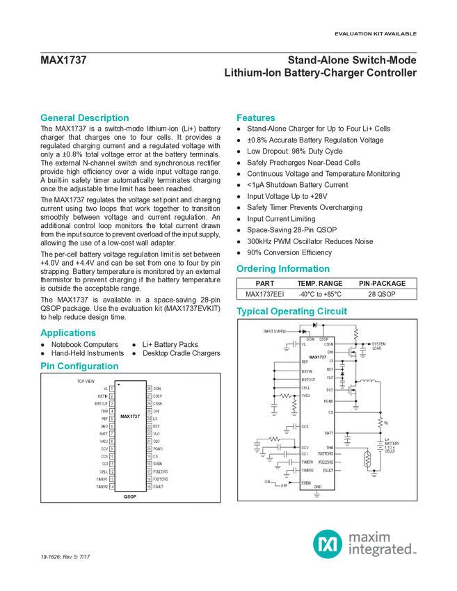 MAX1737 Stand-Alone Switch-Mode Lithium-Ion Battery-Charger Controller