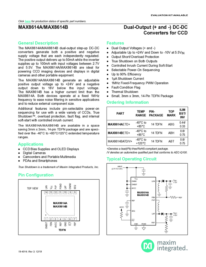 MAX8614A Dual-Output (+ and -) DC-DC Converters for CCD