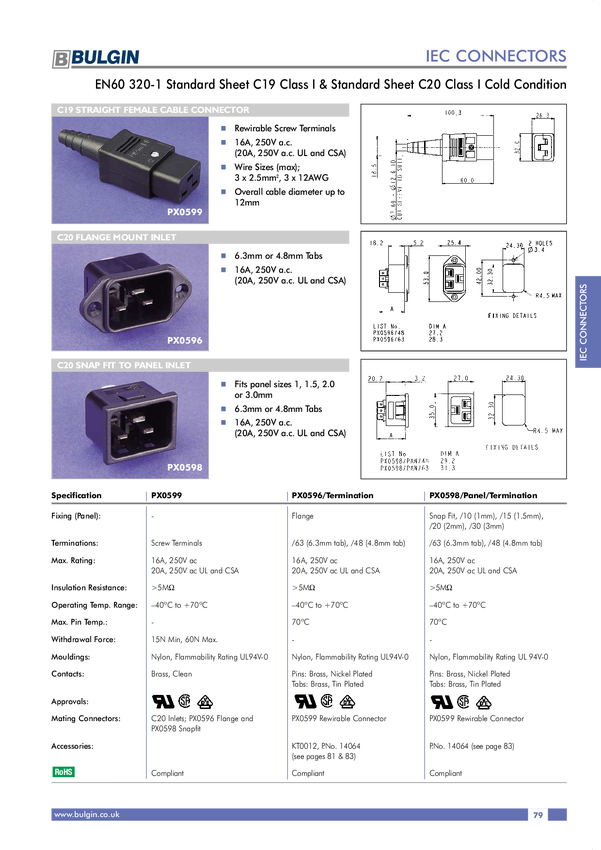 Wtyk żeński; PX0599; zasilające AC; IEC60320 C19; proste; na przewód; 16A; 250V; śrubowy; BULGIN; RoHS