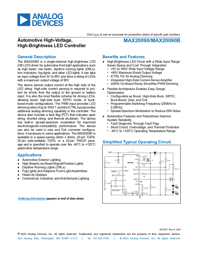 MAX20090 Automotive High-Voltage, High-Brightness LED Controller