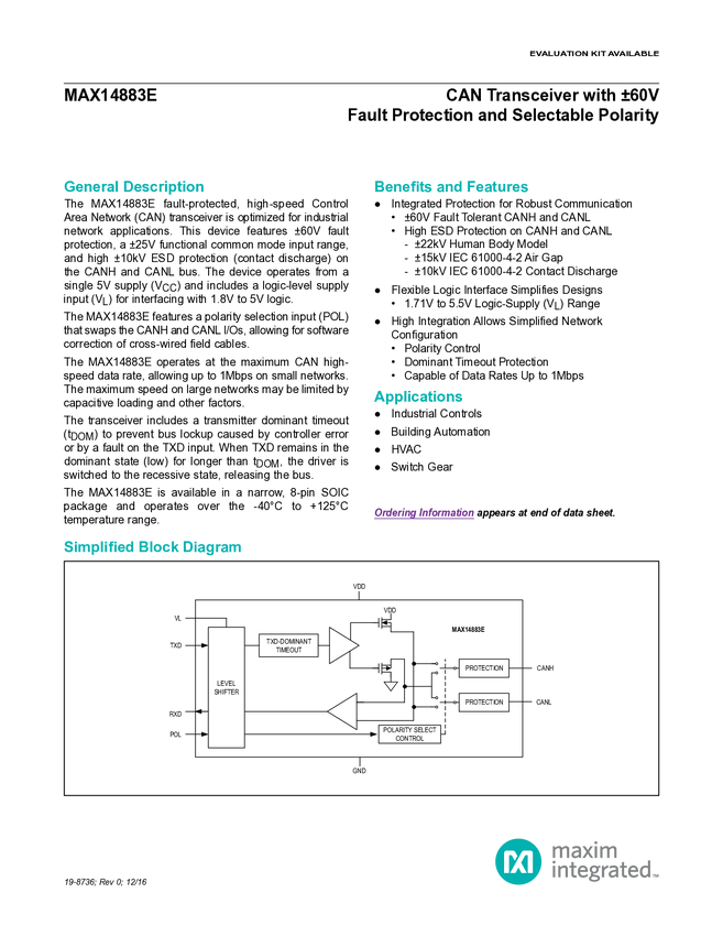 MAX14883E CAN Transceiver with ±60V Fault Protection Selectable Polarity