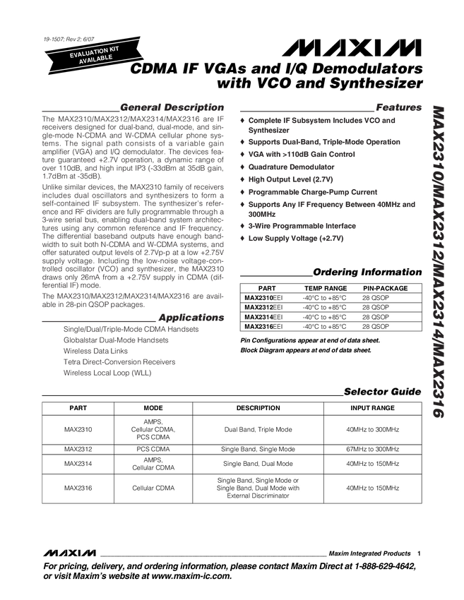 MAX2310 CDMA IF VGAs and I/Q Demodulators with VCO and Synthesizer