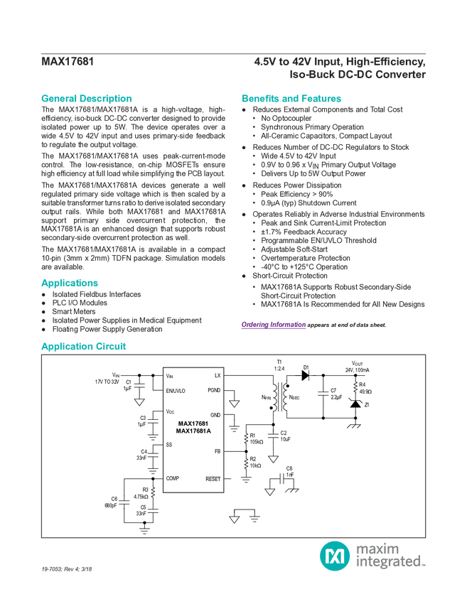 MAX17681 4.5V to 42V Input, High-Efficiency, Iso-Buck DC-DC Converter