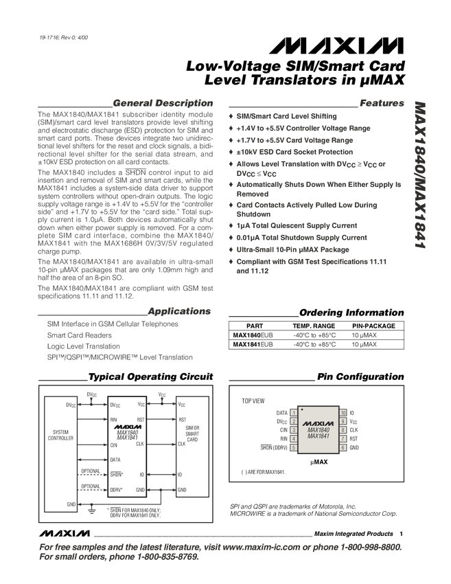 MAX1840 Low-Voltage SIM/Smart-Card Level Translators in µMAX