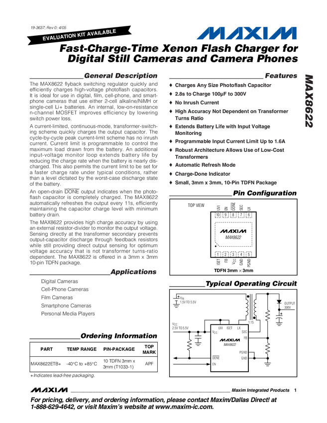 MAX8622 Fast-Charge-Time Xenon Flash Charger for Digital Still Cameras and Camera P...