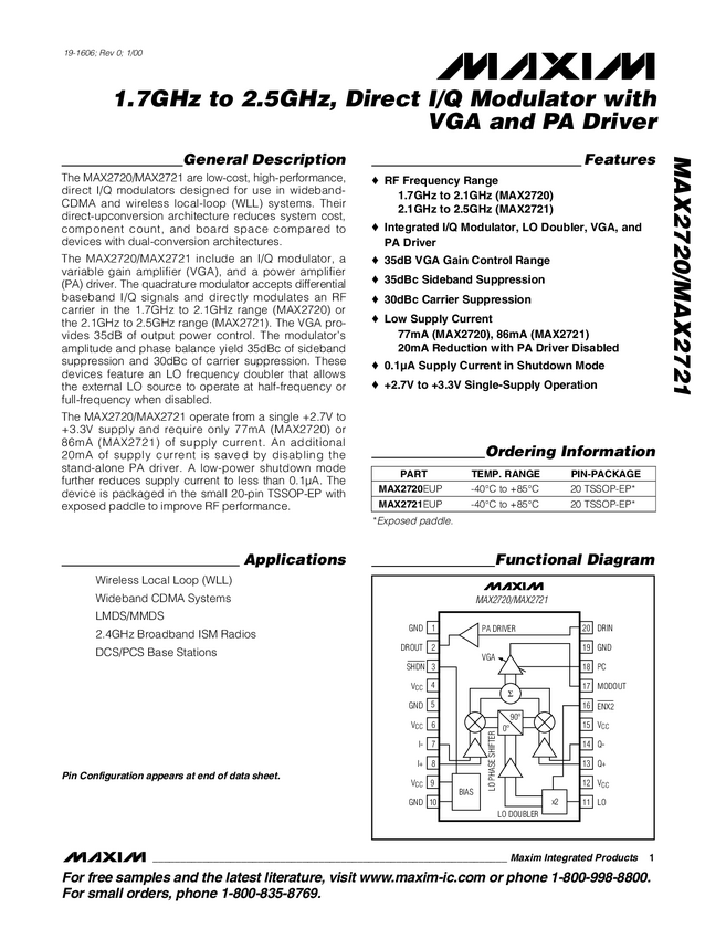 MAX2720 1.7GHz to 2.5GHz, Direct I/Q Modulator with VGA and PA Driver