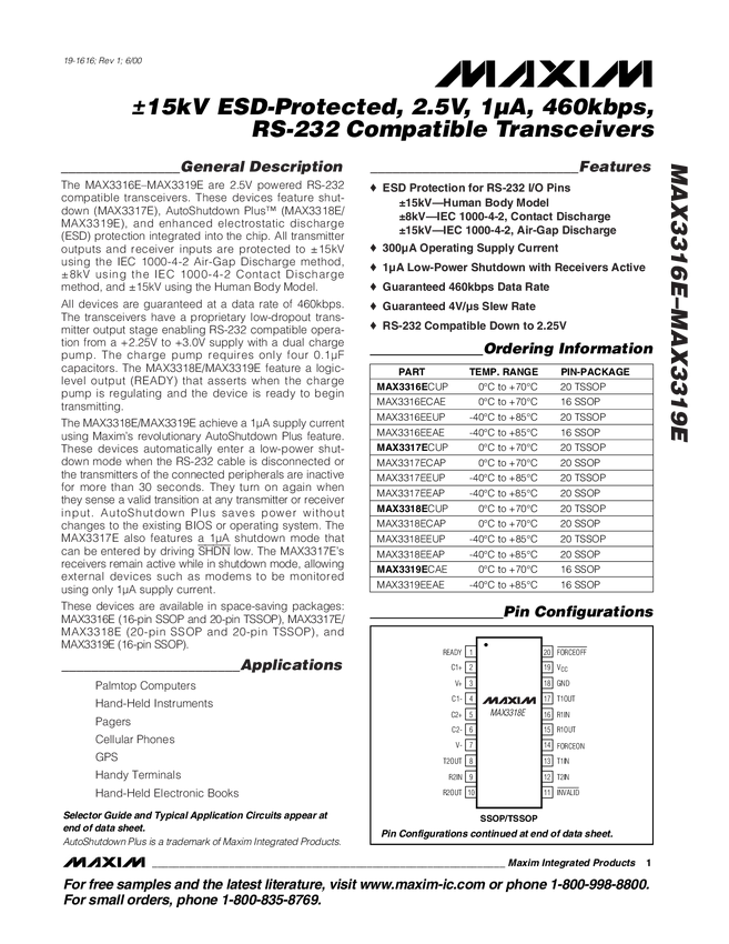 MAX3318E ±15kV ESD-Protected, 2.5V, 1µA, 460kbps, RS-232-Compatible Transceivers