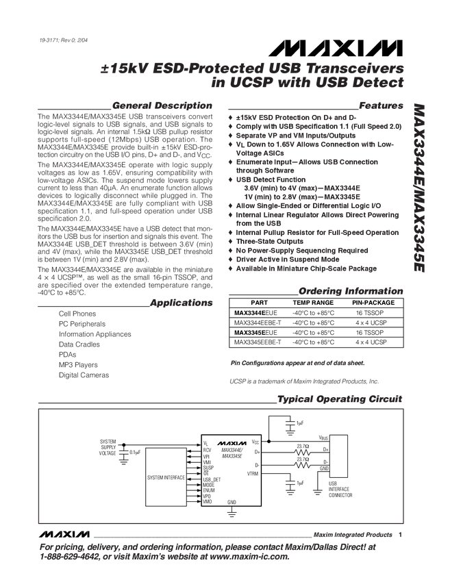 MAX3344E ±15kV ESD-Protected USB Transceivers in UCSP with USB Detect
