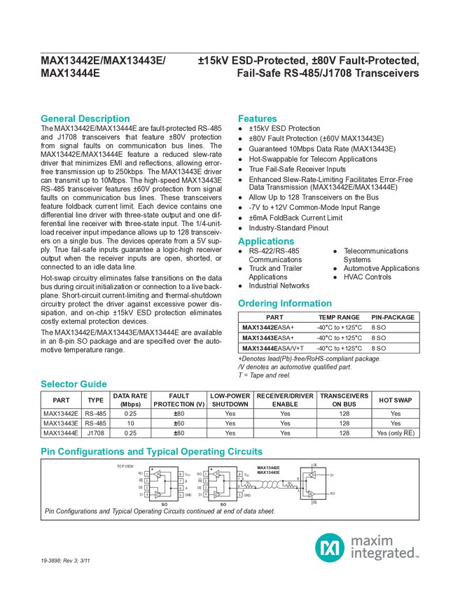 MAX13444E ±15kV ESD-Protected, ±80V Fault-Protected, Fail-Safe RS-485/J1708 Transceiv...