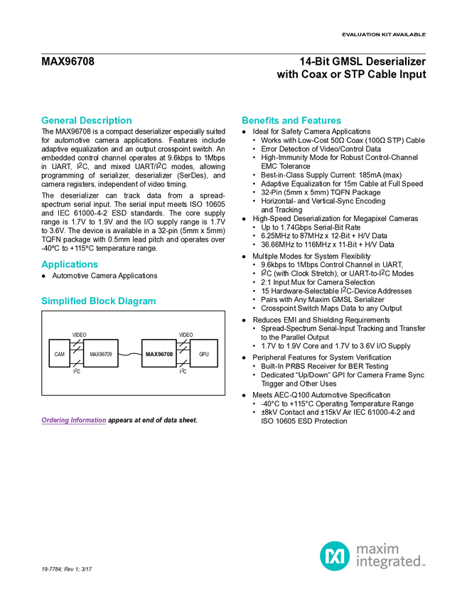 MAX96708 14-Bit GMSL Deserializer with Coax or STP Cable Input