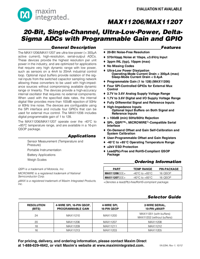 MAX11206 20-Bit, Single-Channel, Ultra-Low-Power, Delta-Sigma ADCs with Programmable...