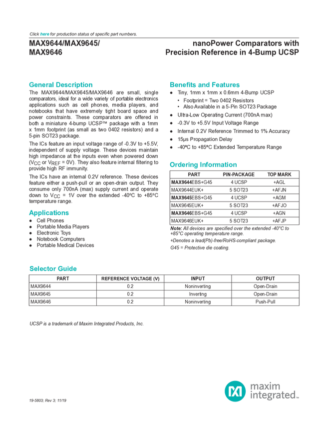 MAX9644 nanoPower Comparators with Precision Reference in 4-Bump UCSP