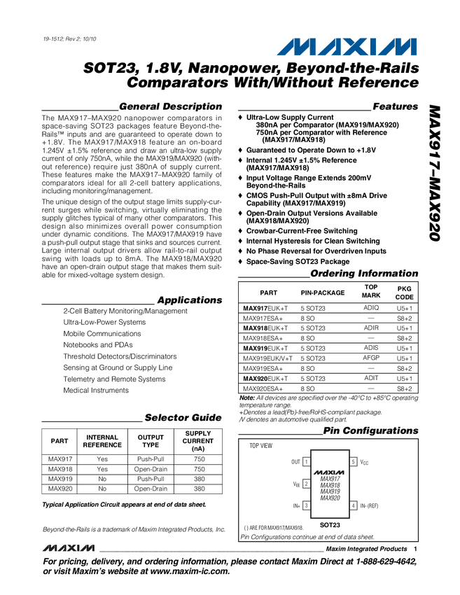 MAX919 SOT23, 1.8V, Nanopower, Beyond-the-Rails Comparators With/Without Reference