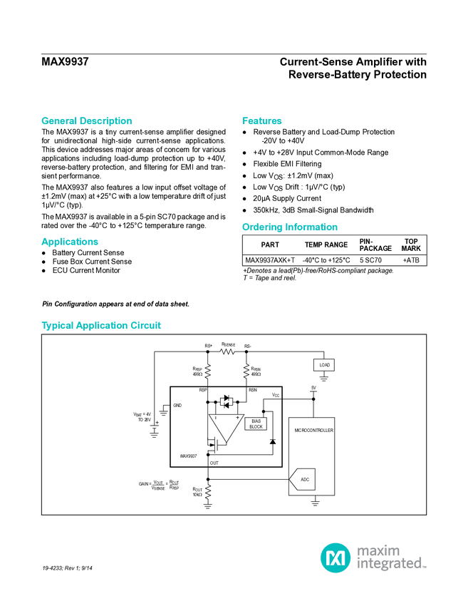 MAX9937 Automotive Current-Sense Amplifier with Reverse-Battery Protection