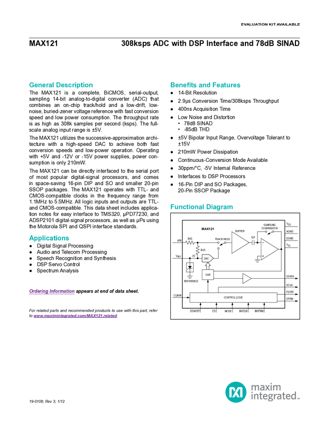 MAX121 308ksps ADC with DSP Interface and 78dB SINAD