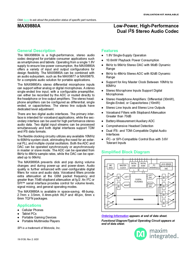 MAX9880A Low-Power, High-Performance, Dual I²S, Stereo Audio Codec