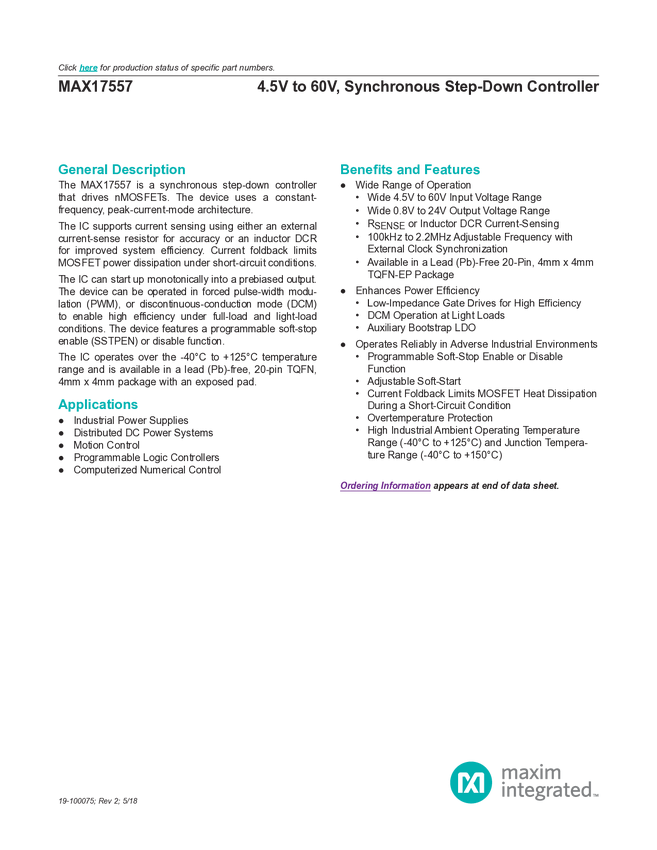 MAX17557 4.5V to 60V, Synchronous Step-Down Controller