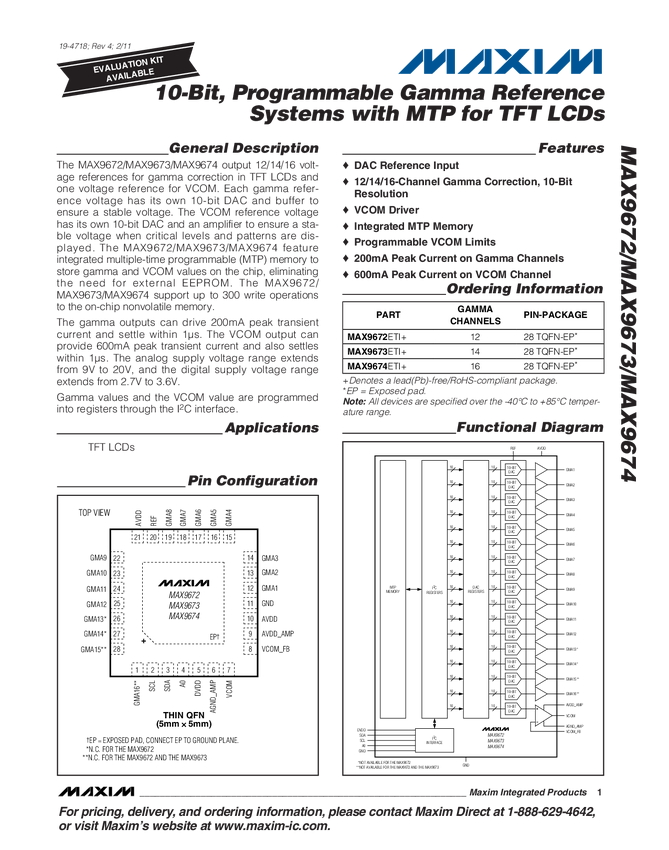 MAX9673 10-Bit, Programmable Gamma Reference Systems with MTP for TFT LCDs