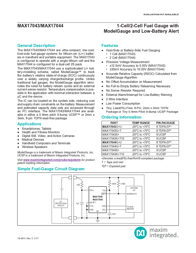 MAX17044 1-Cell/2-Cell Fuel Gauge with ModelGauge and Low-Battery Alert