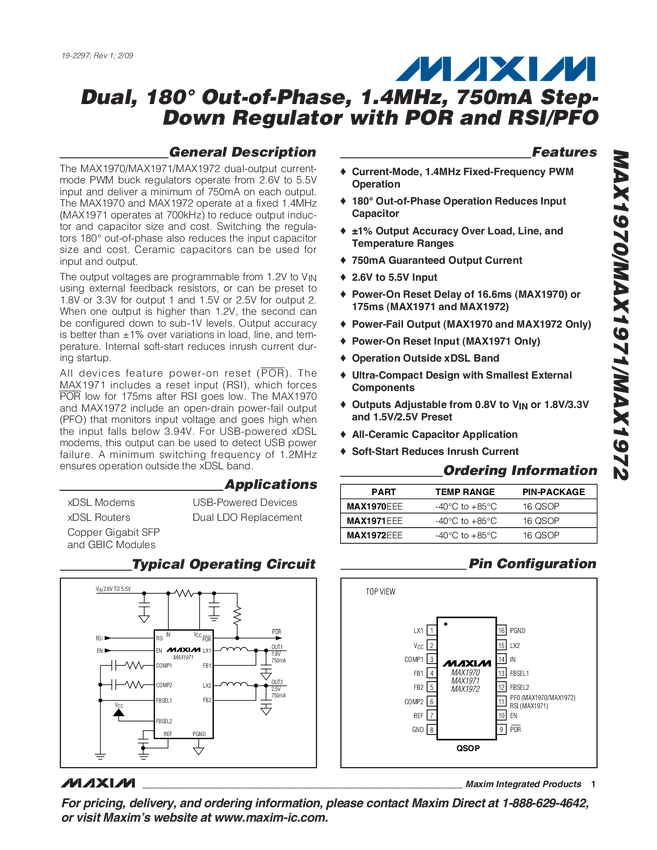 MAX1970 Dual, 180° Out-of-Phase, 1.4MHz, 750mA Step-Down Regulator with POR and RSI...