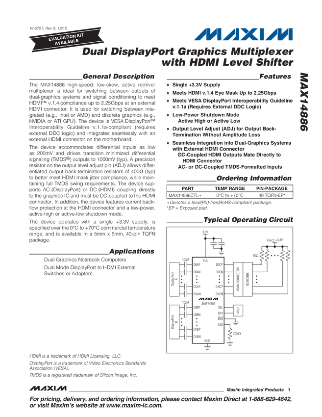 MAX14886 Dual DisplayPort Graphics Multiplexer with HDMI Level Shifter
