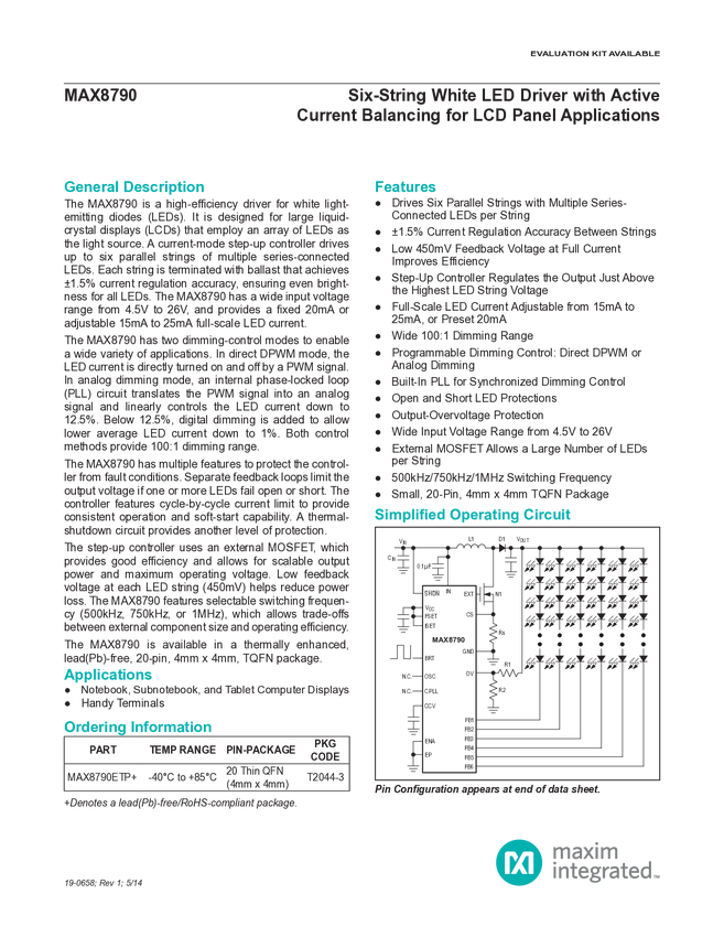 MAX8790 High-Efficiency, 6-String, White-LED (WLED) Driver with Active Current Bala...
