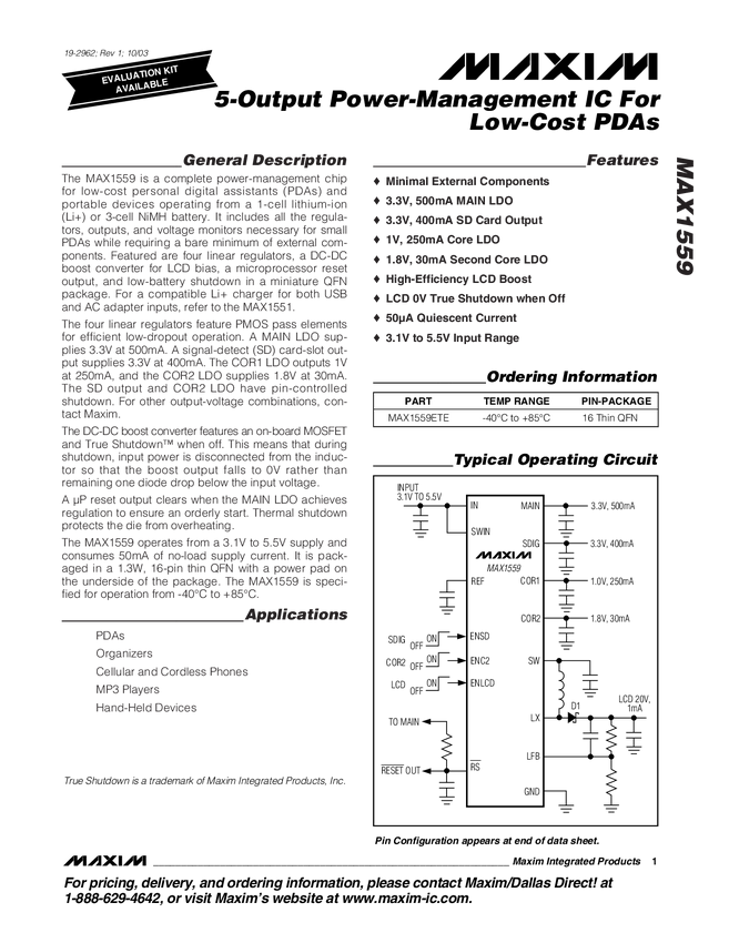 MAX1559 5-Output Power-Management IC For Low-Cost PDAs