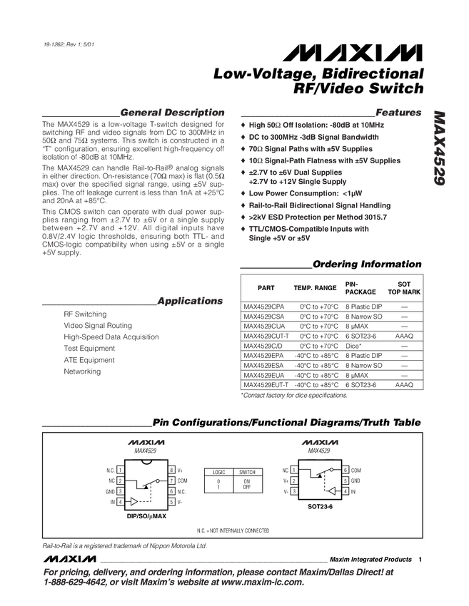 MAX4529 Low-Voltage, Bidirectional RF Video Switch