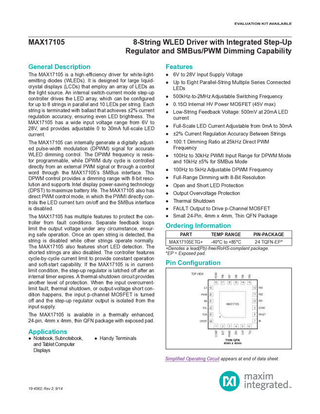 MAX17105 8-String WLED Driver with Integrated Step-Up Regulator and SMBus/PWM Dimmin...