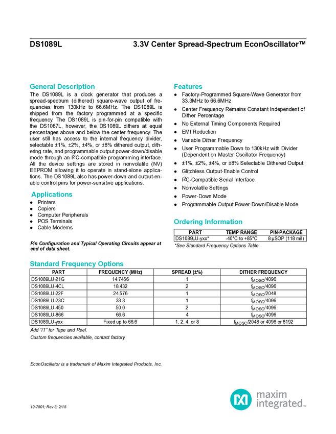 DS1089L 3.3V Center Spread-Spectrum EconOscillator™