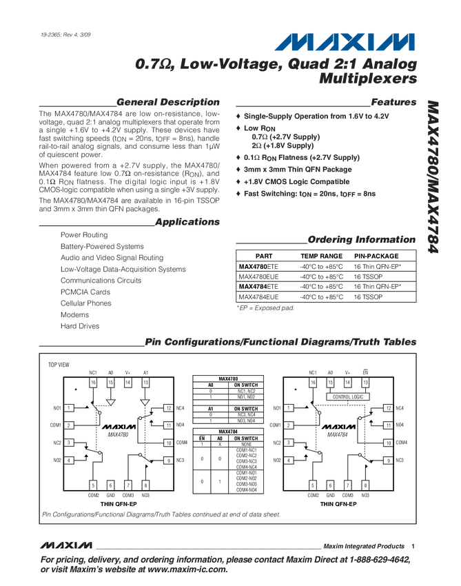 MAX4780 0.7Ω , Low-Voltage, Quad 2:1 Analog Multiplexers