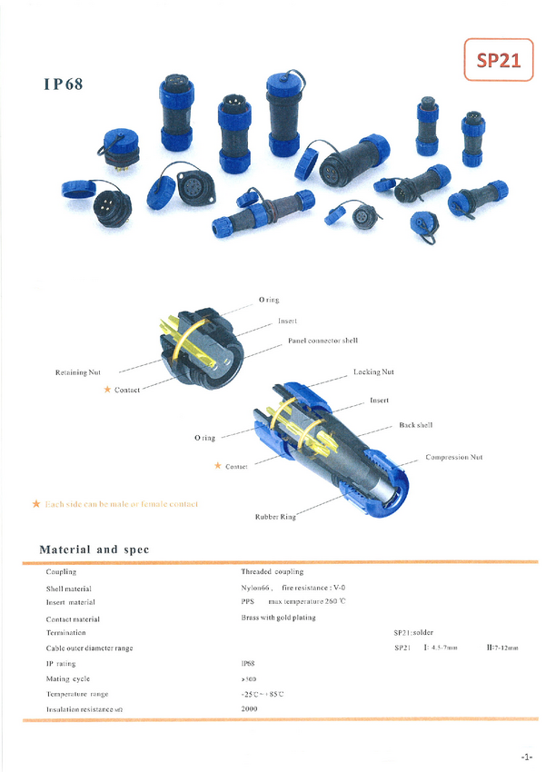 Złącze kompletne hermetyczne; 30A; 500V; wtyk SP2110; 2 tory; 7-12mm; na przewód; gniazdo SP2112; 2 tory; na panel; 21mm; typu Weipu; IP68; RoHS