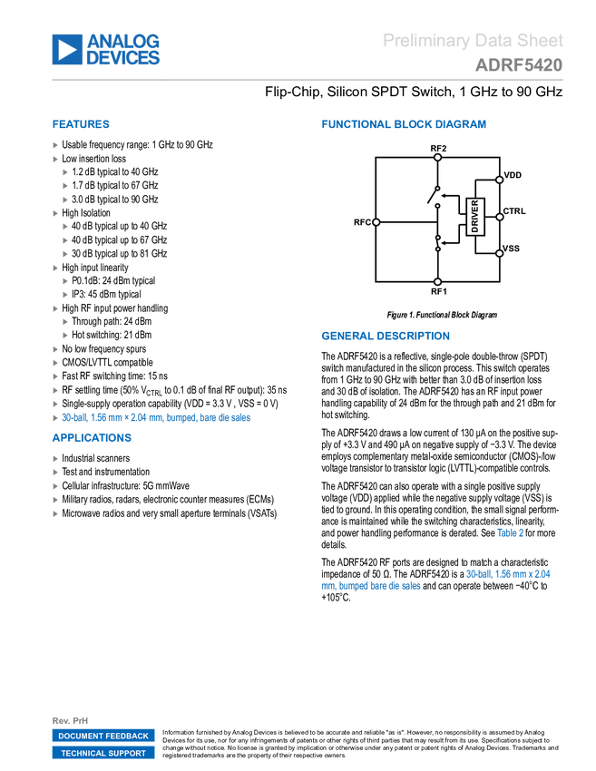 ADRF5420 Flip-Chip, Silicon SPDT Switch, 1 GHz to 90 GHz