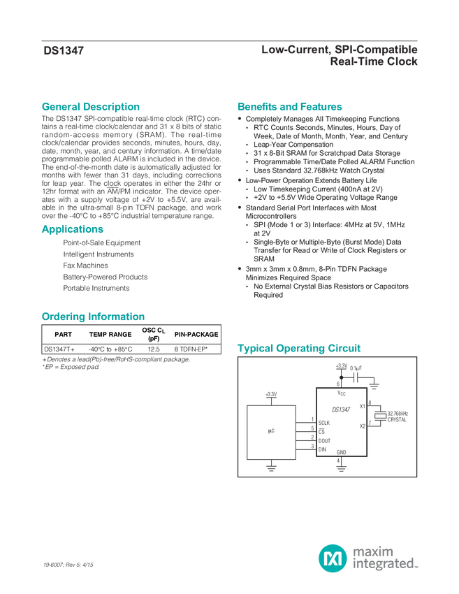 DS1347 Low-Current, SPI-Compatible Real-Time Clock