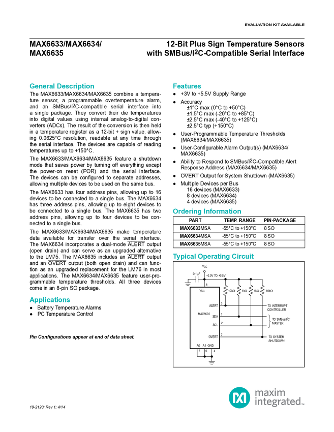 MAX6635 12-Bit Plus Sign Temperature Sensors with SMBus/I²C-Compatible Serial Inter...