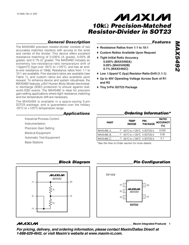 MAX5492 10kΩ Precision-Matched Resistor-Divider in SOT23