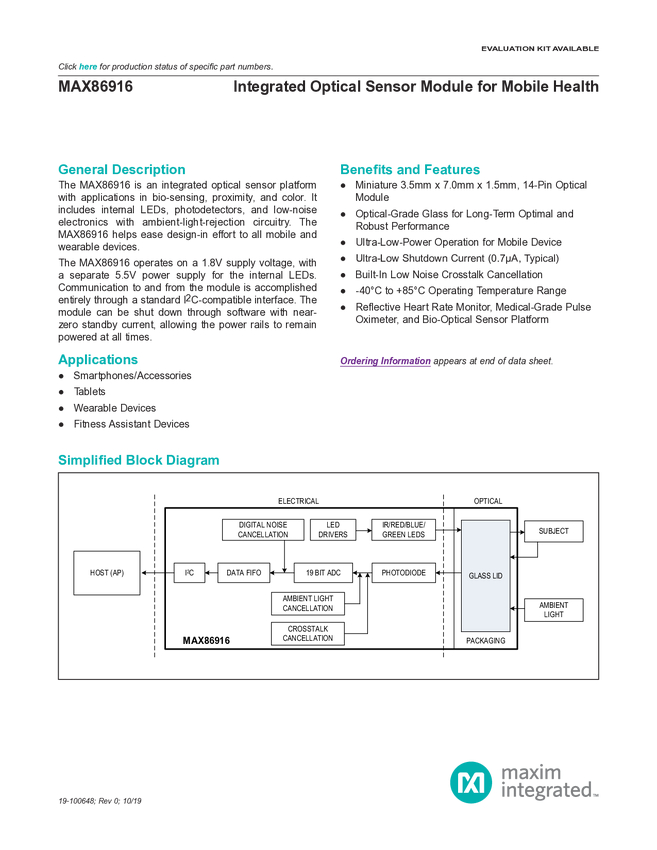 MAX86916 Integrated Optical Sensor Module for Mobile Health