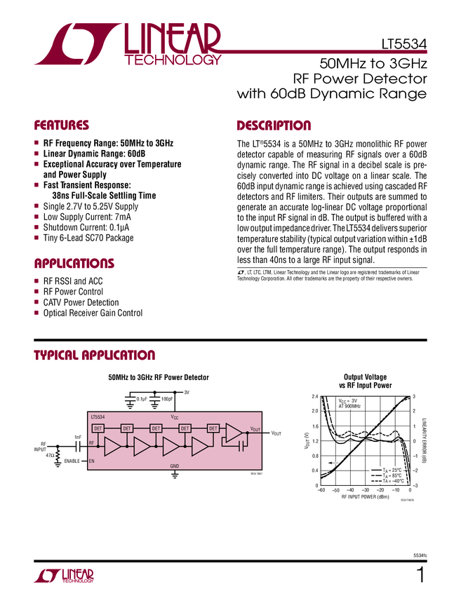 LT5534 50MHz to 3GHz RF Power Detector with 60dB Dynamic Range