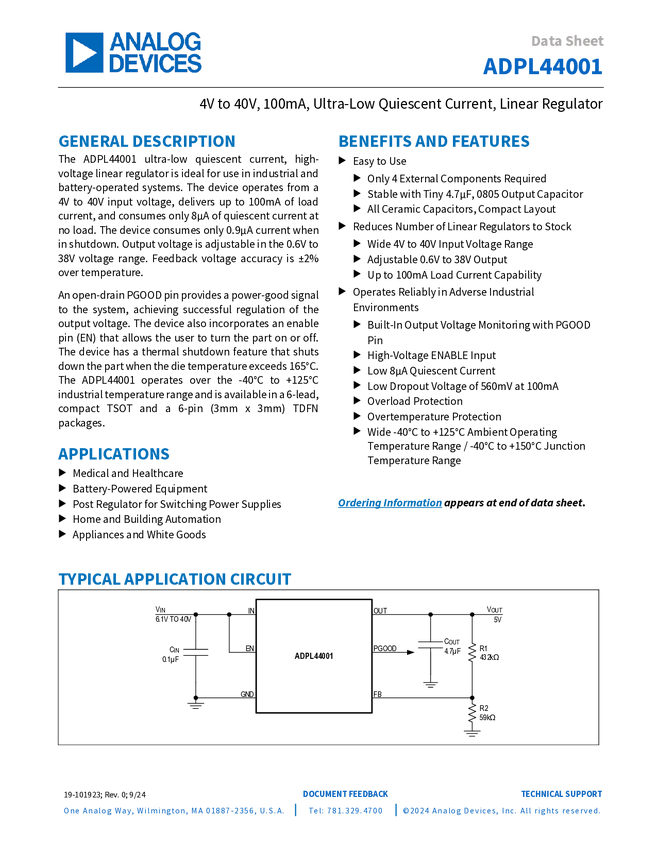 ADPL44001 4V to 40V, 100mA, Ultra-Low Quiescent Current, Linear Regulator
