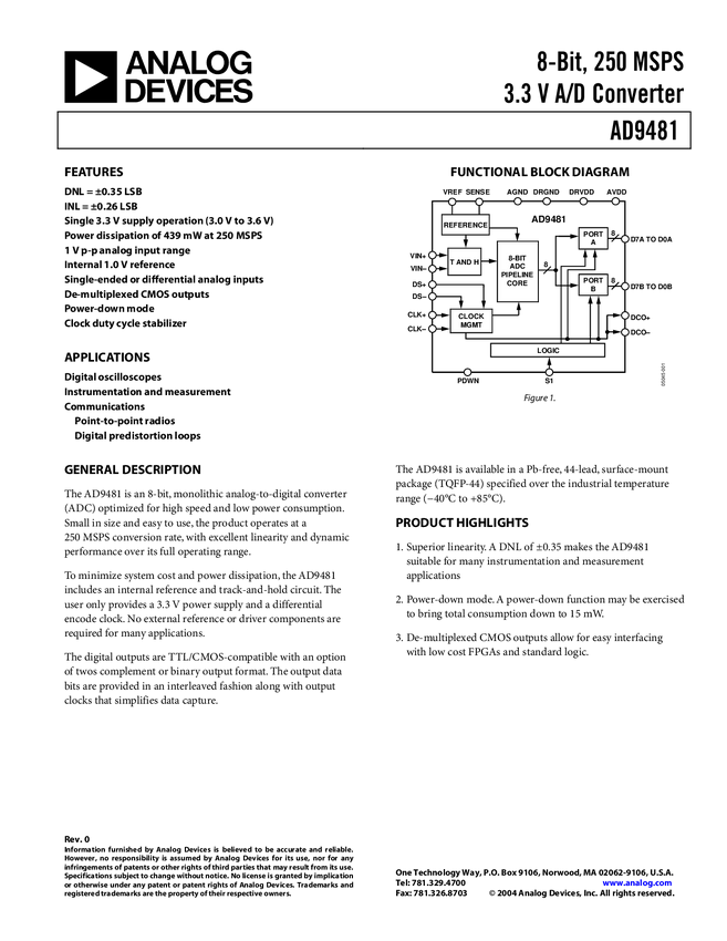 AD9481 8-Bit, 250 MSPS, 3.3 V A/D Converter