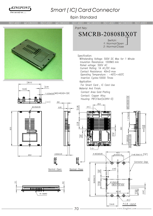 Złącze; SMCRB-20808B20T; do kart; Smart Card; 8 torów; THT; poziome; złocone; 1A; 9003-A08C007T1A; OUPIIN; RoHS