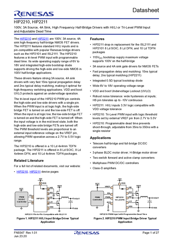 HIP2210 100V, 3A Source, 4A Sink, High Frequency Half-Bridge Drivers with Tri-Level...