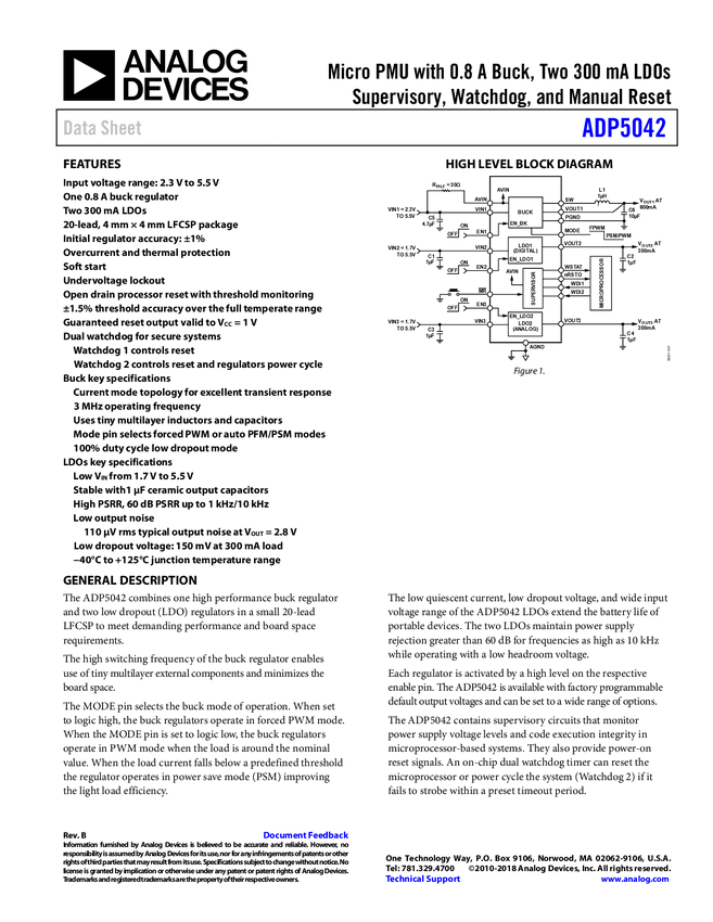 ADP5042 Micro PMU with 0.8 A Buck, Two 300 mA LDOs, Supervisory, Watchdog and Manua...
