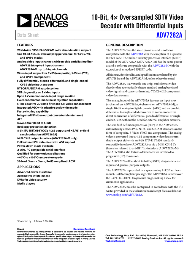ADV7282A 10-Bit, 4× Oversampled SDTV Video Decoder with Differential Inputs