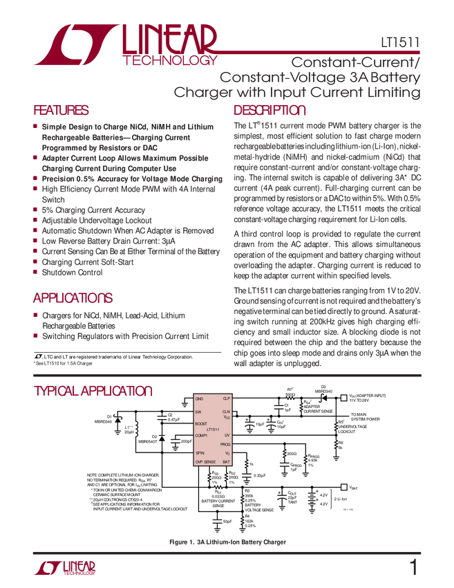 LT1511 Constant-Current/Constant-Voltage 3A Battery Charger with Input Current Lim...