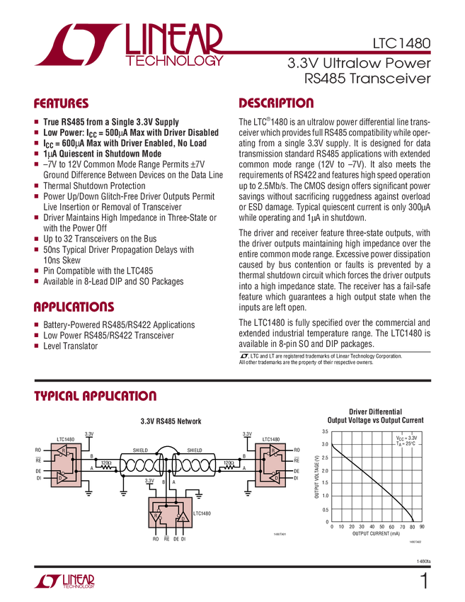 LTC1480 3.3V Ultralow Power RS485 Transceiver