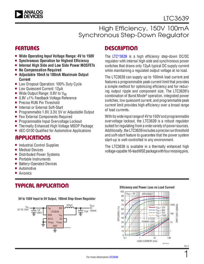 LTC3639 High Efficiency, 150V 100mA Synchronous Step-Down Regulator