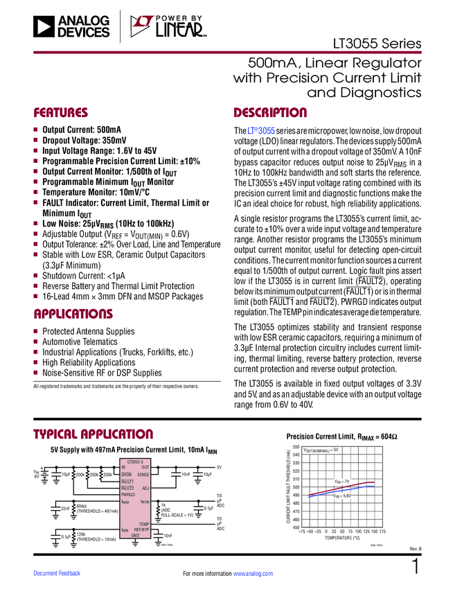 LT3055 Series 500mA, Linear Regulator with Precision Current Limit and Diagnostics