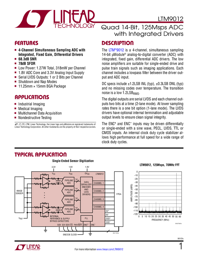 LTM9012 Quad 14-Bit, 125Msps ADC with Integrated Drivers