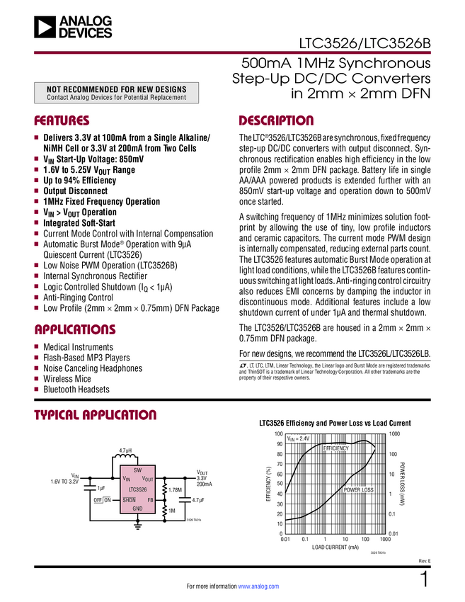 LTC3526 500mA 1MHz Synchronous Step-Up DC/DC Converters in 2mm × 2mm DFN